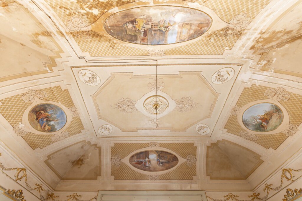 Ambienti interni con affreschi, camini d’epoca, volte e scala scenografica
