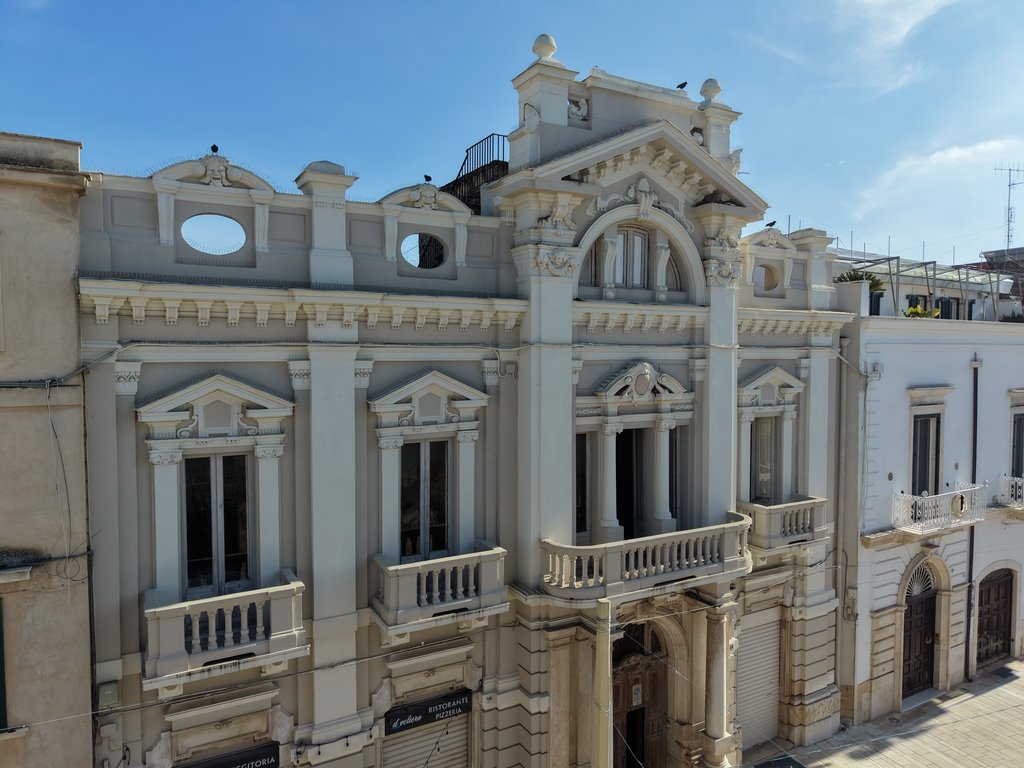 Tra le vie più antiche di Adelfia, Palazzo Angiuli si presenta come una scenografia già pronta: facciata tardo barocca, balconi in pietra locale, portale d’ingresso che comunica rango e storia al primo sguardo.